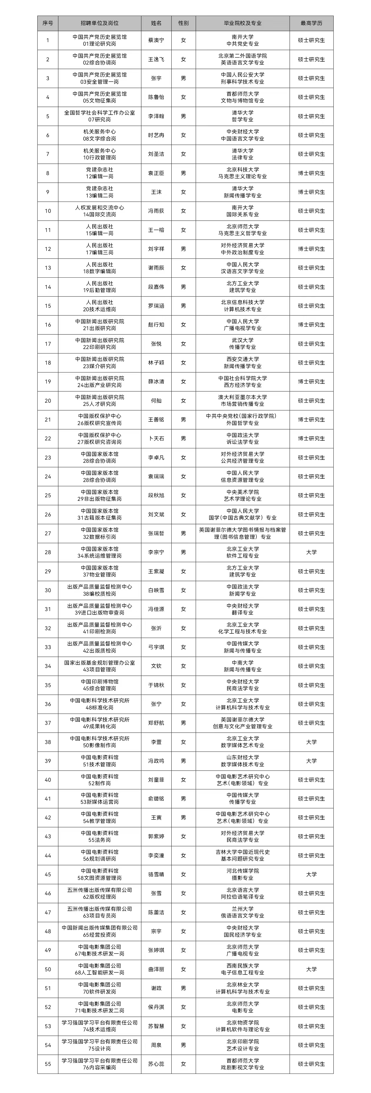 根据《事业单位人事管理条例》等相关规定,按照中央宣传部直属单位2025年度公开招聘工作安排,经过笔试、面试、体检、考察等程序,现将拟聘用人员名单予以公示: