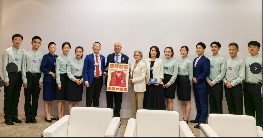 王官升向达沃斯创始人施瓦布主席赠送志愿服务马甲。(图片来源:王官升)